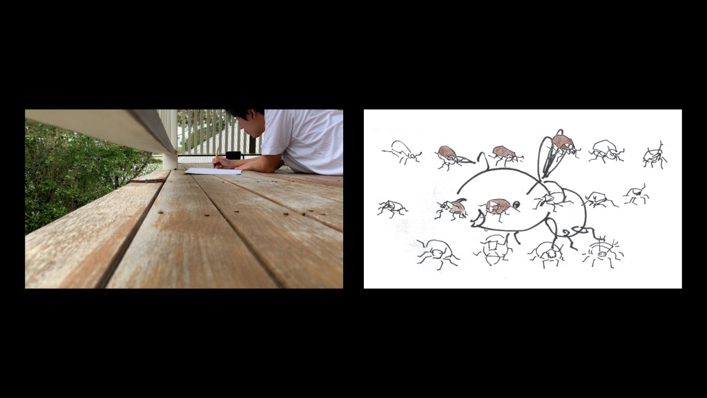 Synopsis: Lately, I spent a few hours every morning on the balcony at my house on Spring Street. Reading, stretching and getting the sun. I just noticed there were little insects coming and going time after time. I put a pen and a small notebook beside my mat so when any comer stopped by, I could spend some time interacting with them. I noticed that I felt calmer than before. The anxiety of missing catching moments was gone. I realised that when one is gone, the other one will come. I will have a next chance when the time comes.