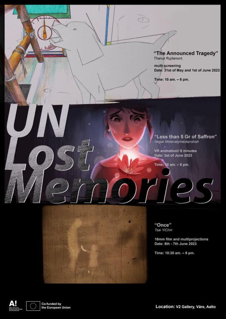 Un Lost Memories is a group exhibition held at V2 Gallery at Vare, Aalto, Espoo, Finland, between May 31 – June 7, 2023, with the collaboration between three artist – Negar Motevalymeidanshah, Thanut Rujitanont and Tsai Yi-Chin.